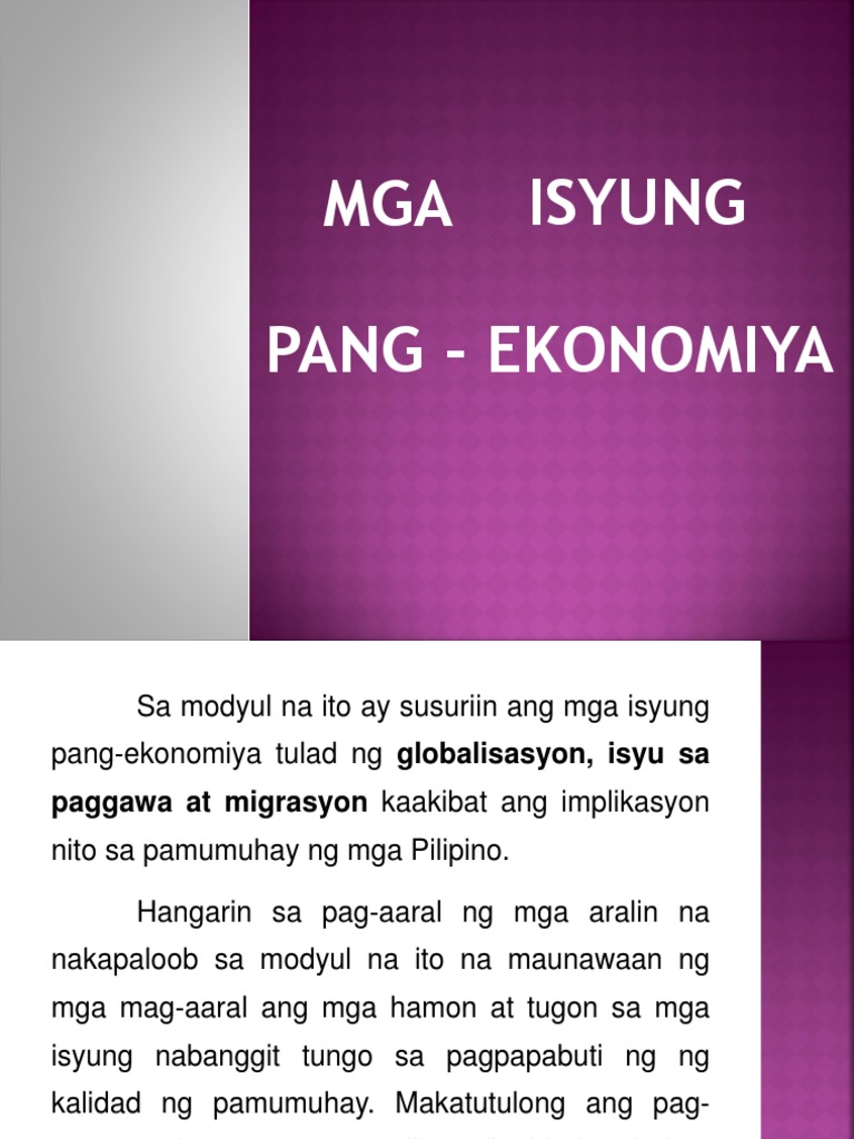M0dyul 2 Mga Isyung Pang Ekonomiya Aralin 1 Glabalisasyon Konsepto. Isyung pang ekonomiya Kabilang sa mga isyung suliranin ng ekonomiya ang agrikultura trabaho at ang sahod minimum wage kontraktuwalisasyon hindi permanenteng trabaho OFWs usaping pangkapaligiran industriyalisasyon foreign trade at globalisasyon. Ang ekonomiks ay isang pag-aaral kung paano gagamitin ang mga limitadong pinagkukunang yaman upang makagawa at maipamahagi ang ibat-ibang produkto at serbisyo sa mga tao at ibat-ibang pangkat ng lipunan para sa kasalukuyan at hinaharap.