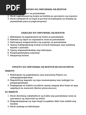 Mga programa para sa mga bumubuo ng impormal na sektor. Fajardoaklat na ekonomiks development 1994- inilahad na magkaiba ang. O Hindi nakarehistro sa pamahalaan o Hindi nagbabayad ng buwis mula sa kinikita sa operasyon ng negosyo o Hindi nakapaloob sa legal at pormal na balangkas na inilatag ng pamahalaan para sa pagnenegosyo Kabilang sa impormal na sektor ang mga sumusunod.